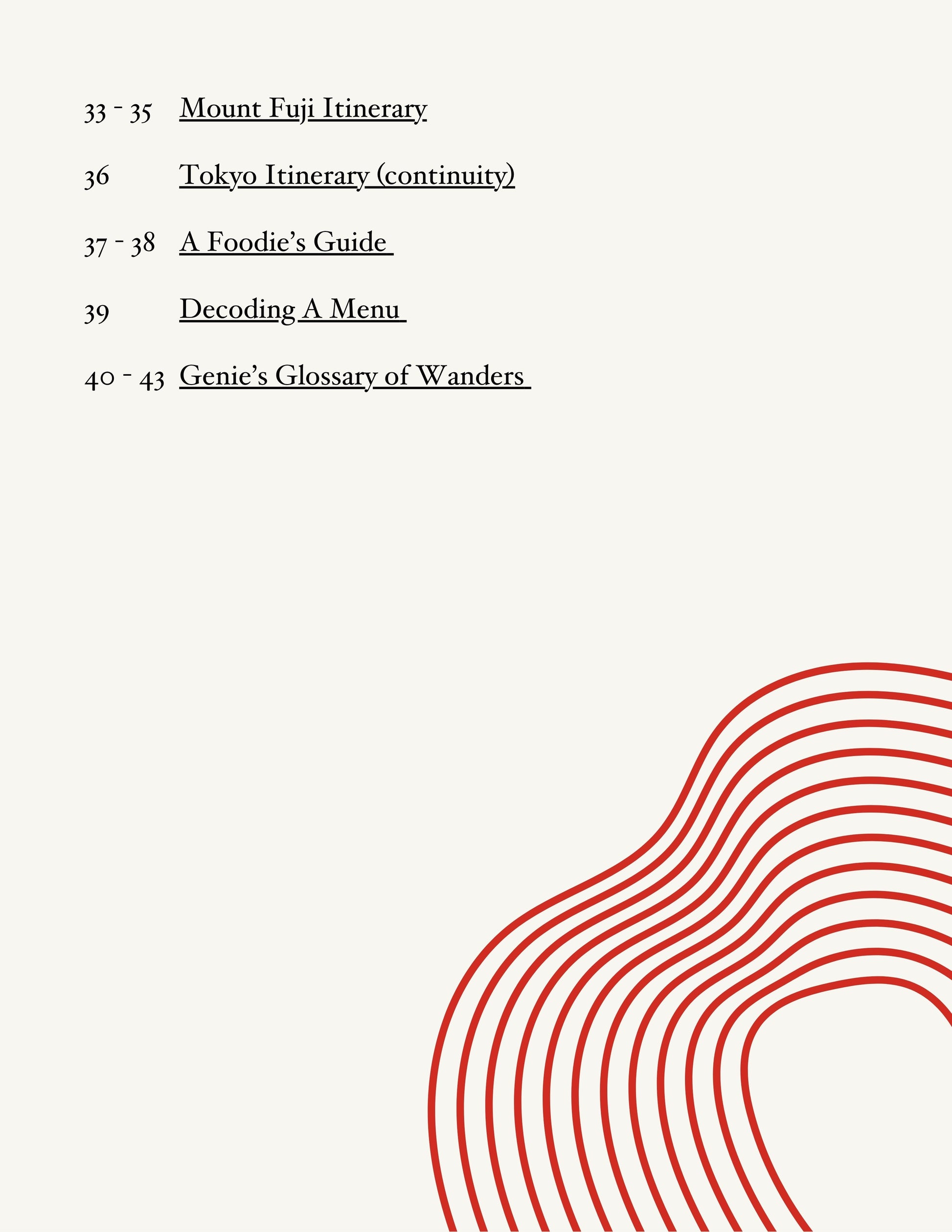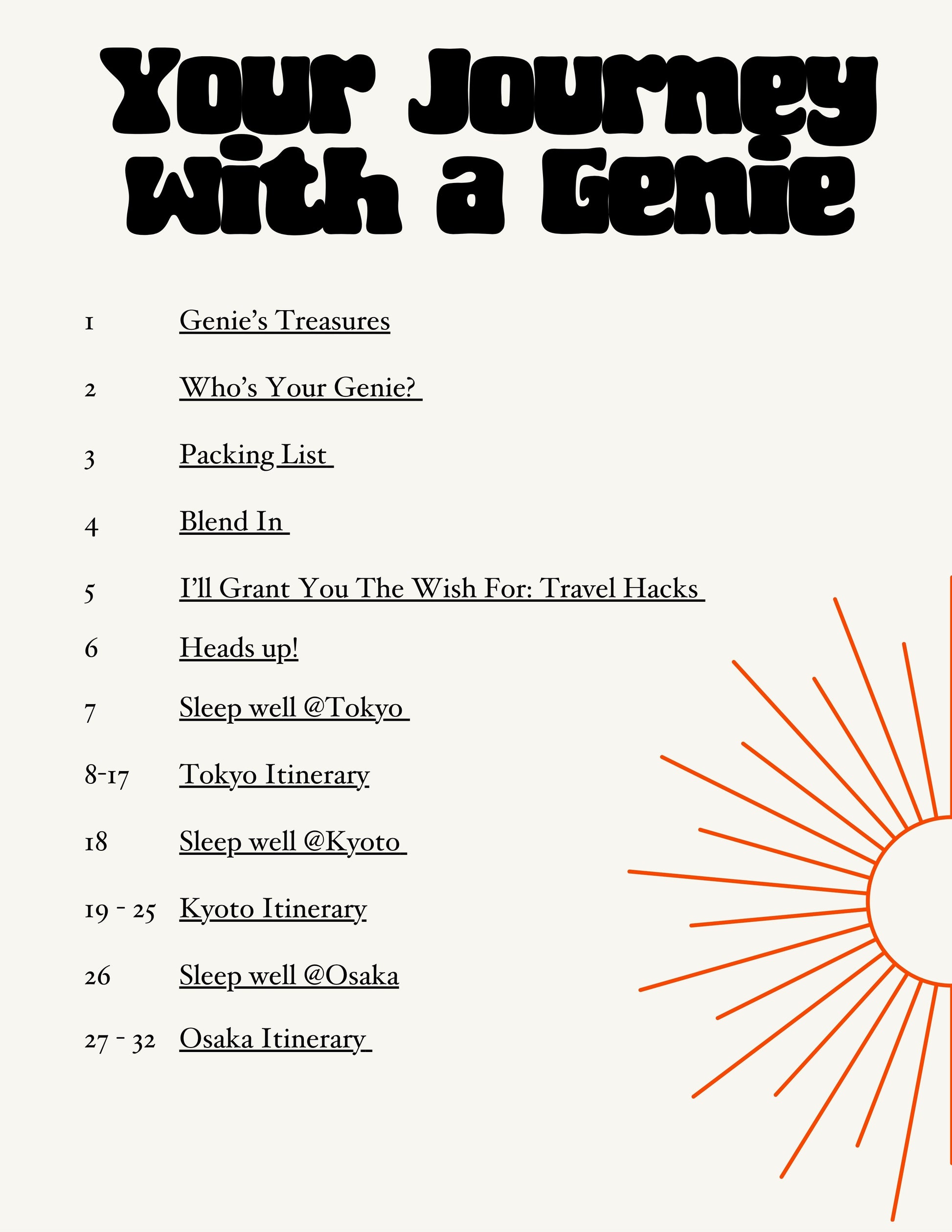 You'll find a detailed day-by-day itinerary exploring Tokyo, Kyoto, Osaka, Mount Fuji, Enoshima — including themed parks —plus a packing list, travel hack list, highlights' glossary, foodie guide and tips for decoding menus.