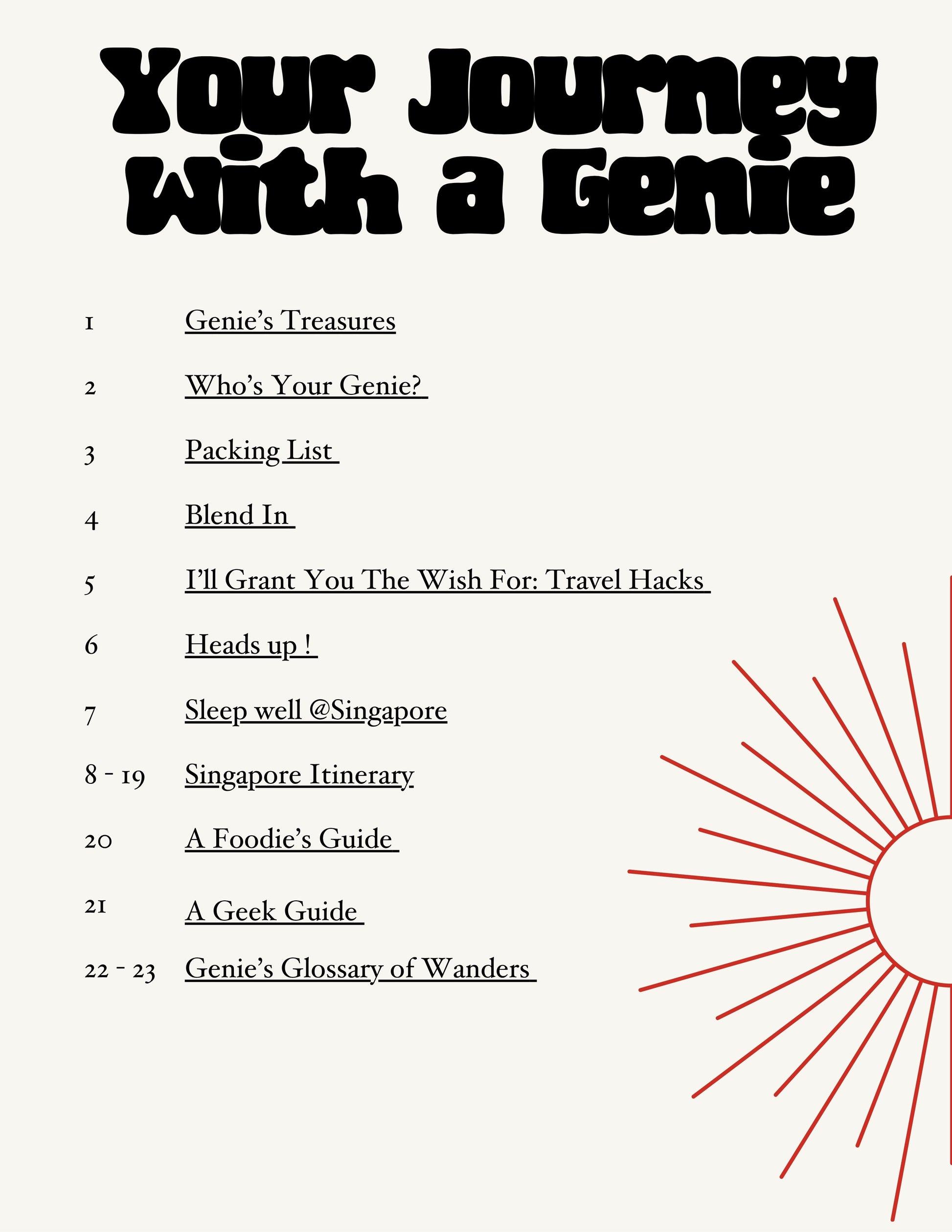 You'll find a detailed day-by-day itinerary exploring Singapore —plus a packing list, travel hack list, highlights' glossary, foodie guide and a geek guide.