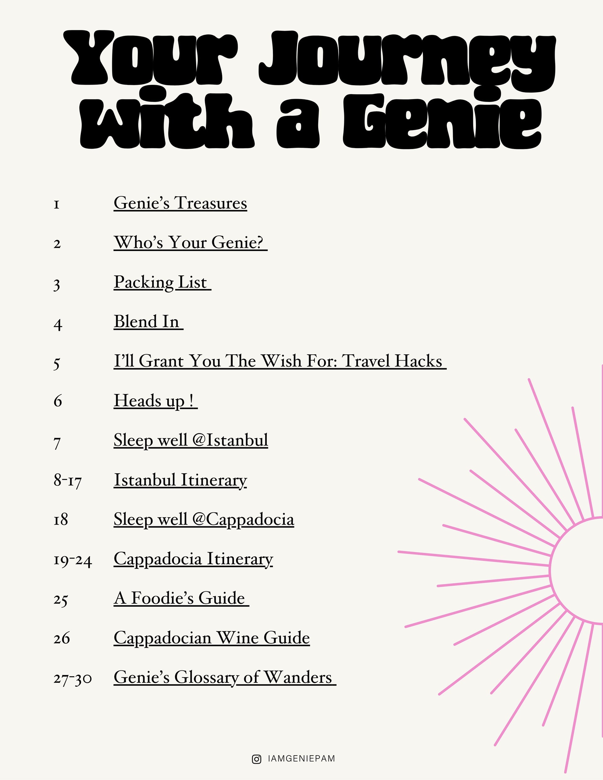 You'll find a detailed day-by-day itinerary exploring Istanbul and Cappadocia plus a packing list, travel hack list, highlights' glossary, foodie guide and a local wine guide.