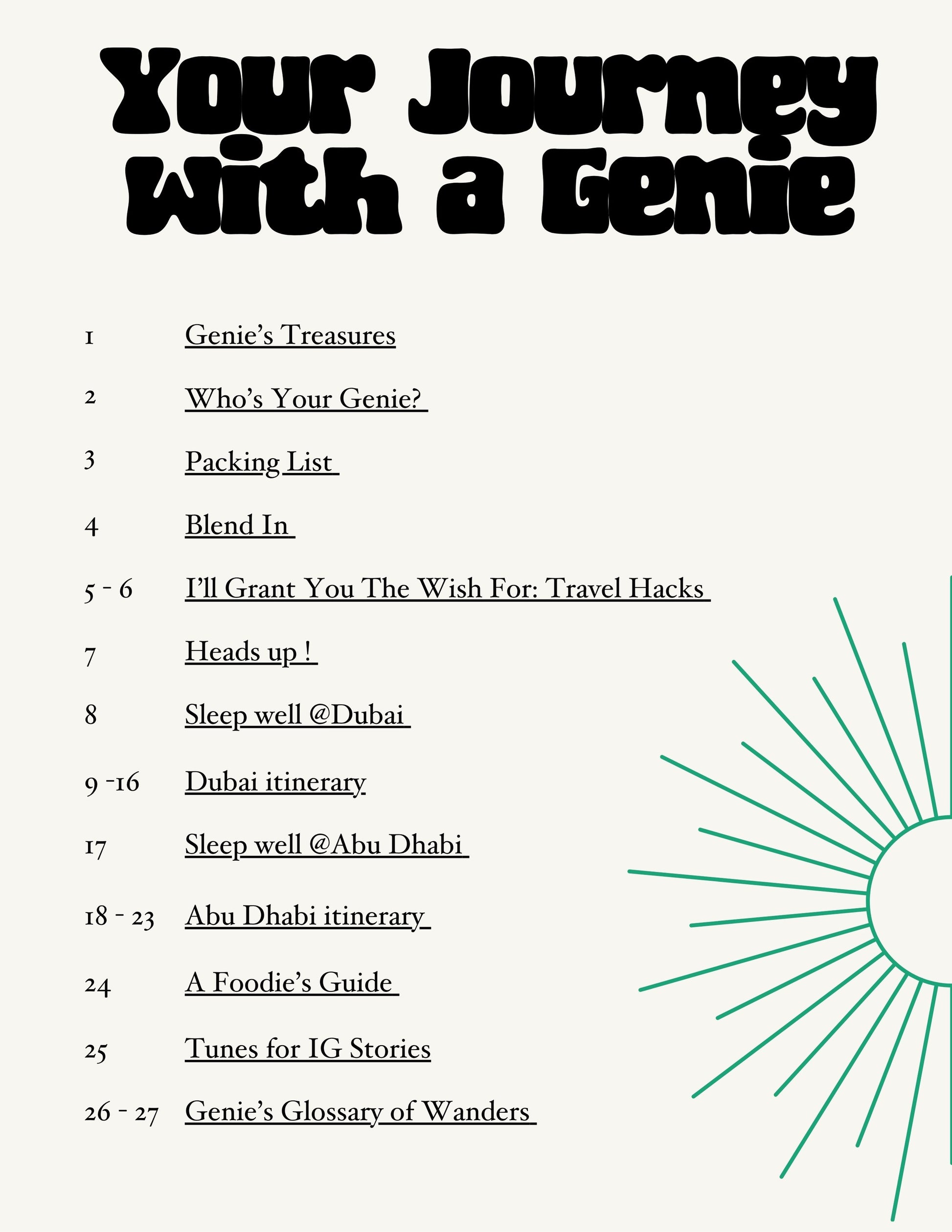You'll find a detailed day-by-day itinerary exploring Dubai and Abu Dhabi plus a packing list, travel hack list, highlights' glossary and foodie guide.